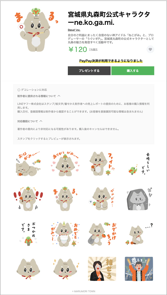 丸森町公式キャラクター「ねこがみとうぐいすP」のLINEスタンプも発売中です。眠そうなねこがみ、嬉しそうなねこがみ、頑張るねこがみ、驚くねこがみ、落ち込むねこがみ、おめでたいねこがみ、不思議がるねこがみ、さまざまなねこがみをお楽しみください。